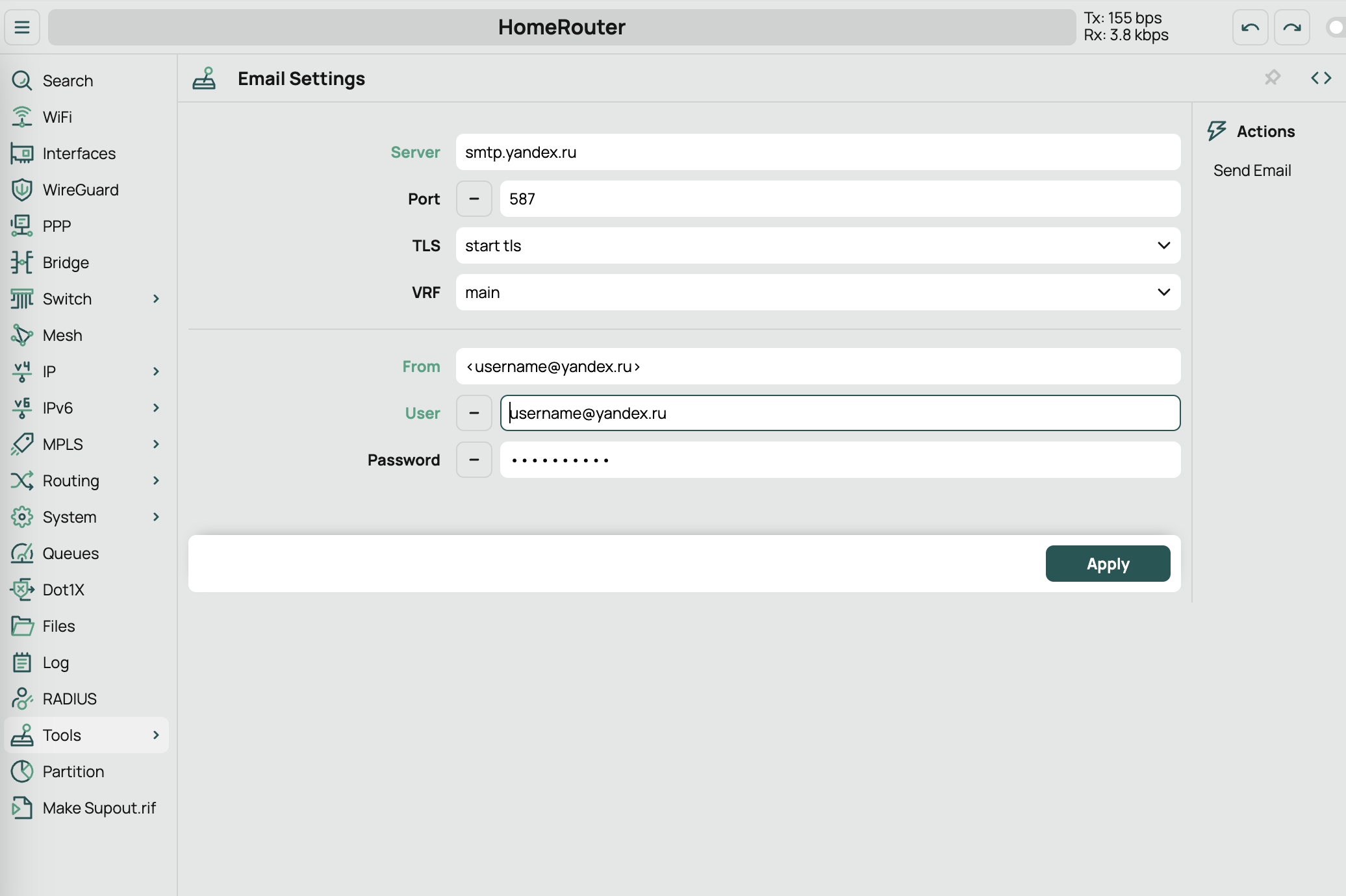 Необходимо настроить отправку почты с устройства Mikrotik в меню