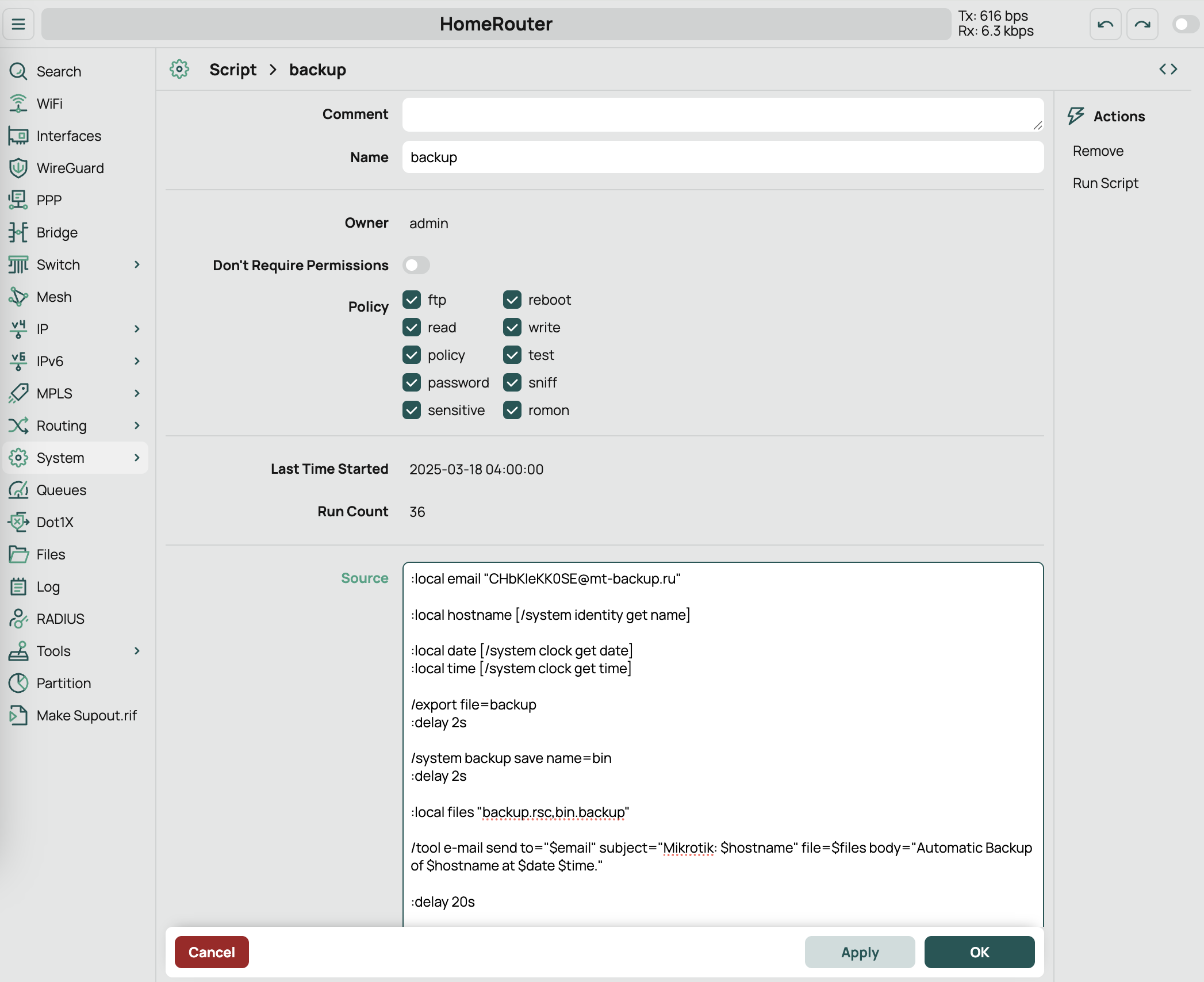 /system script add dont-require-permissions=no name=mtbackup policy= ftp,reboot,read,write,policy,test,password,sniff,sensitive,romon source="\