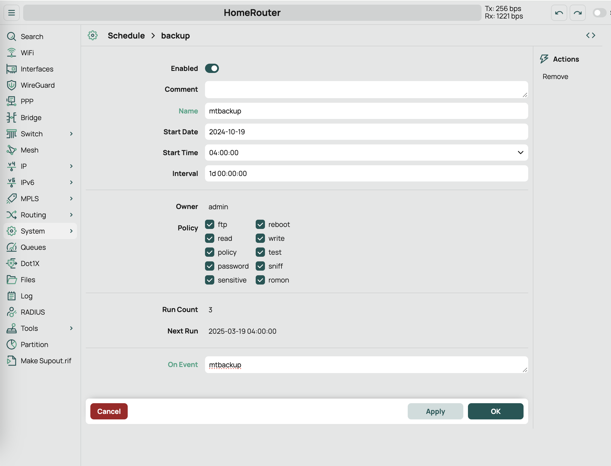 /system scheduler add name="mtbackup" interval="1d 00:00:00" start-date="2025-12-06" start-time="04:00:00" policy=ftp,read,policy,password,sensitive,reboot,write,test,sniff,romon on-event="mtbackup"